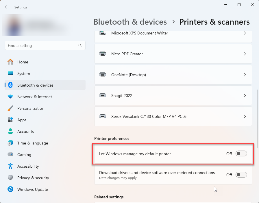 - In the Printers & scanners window, make sure Let Windows manage my default printer is OFF