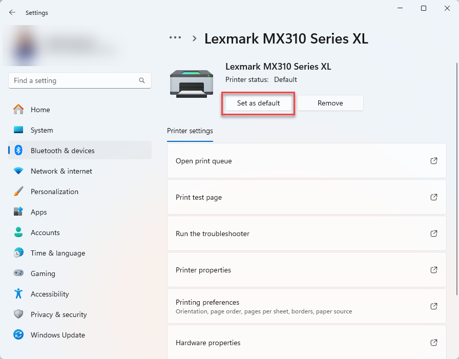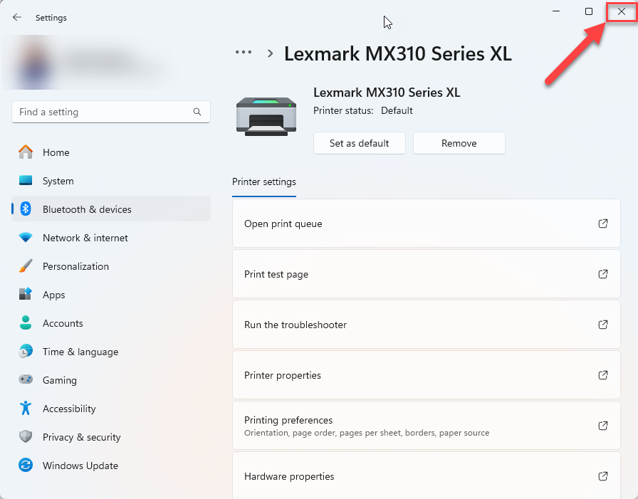 - Your desired printer has now been set as the default. You may now close the Settings window by clicking the X button in the top-right corner.