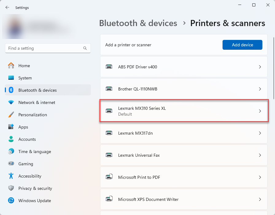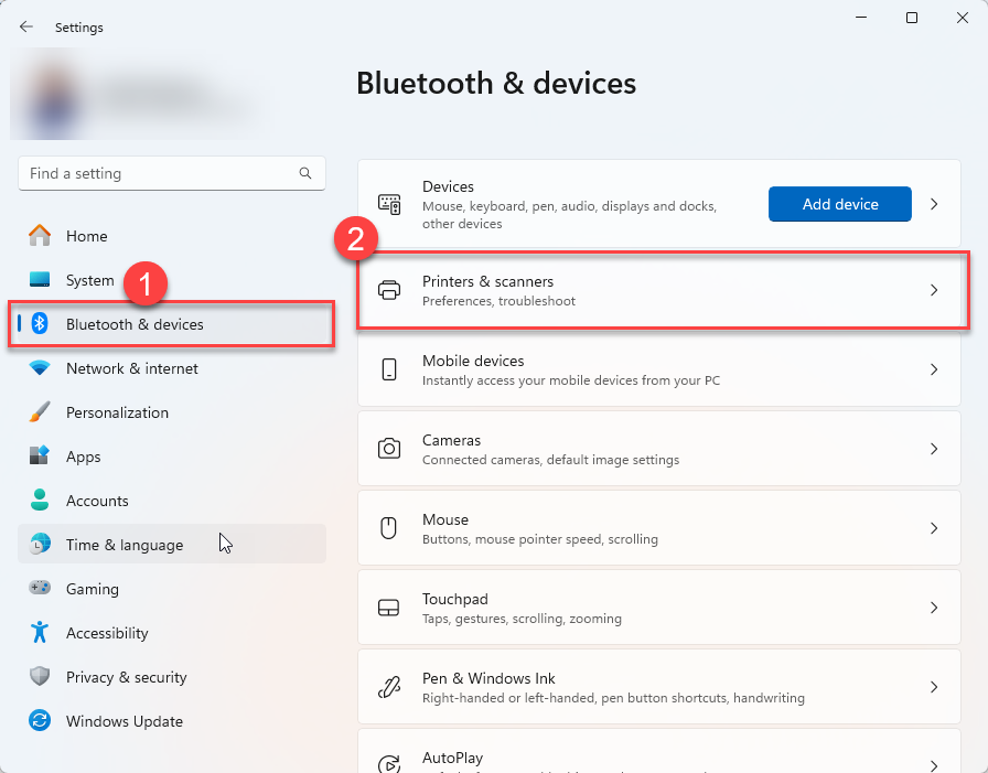 - Select Start > Settings > Bluetooth & devices > Printers & scanners